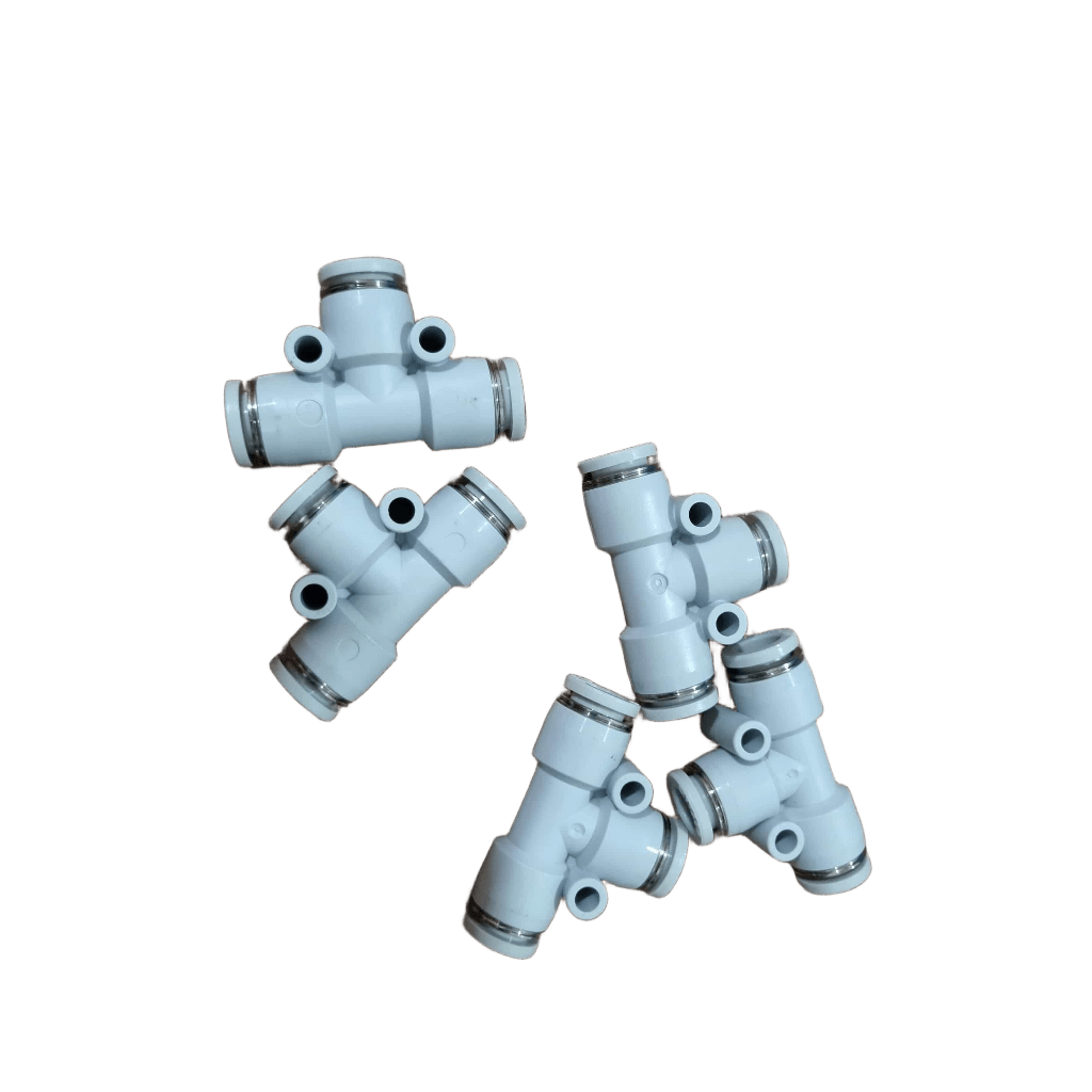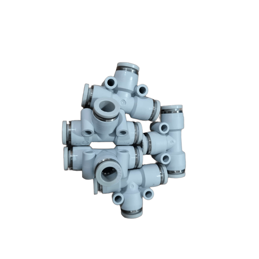 - ข้อต่อสามทางสายลมขนาด 8 มม. (แบบตัว T) เป็นอุปกรณ์นิวเมติกส์ที่ใช้สำหรับแยกหรือรวมทิศทางของสายลมในระบบ โดยมีช่องเสียบสายลมขนาด 8 มม. เท่ากันทั้งสามด้าน