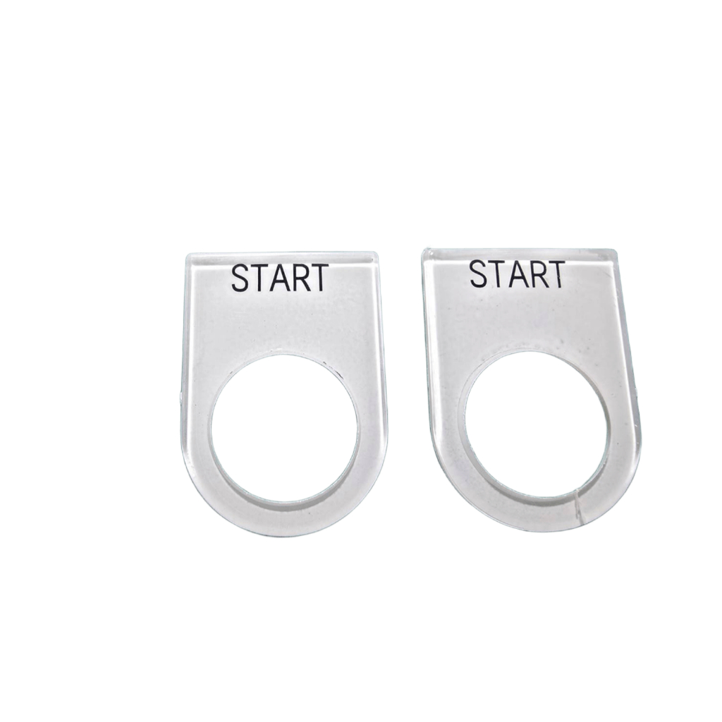 ป้ายเนมเพลท ที่มีข้อความ “START” สำหรับติดตั้งกับตู้ควบคุมหรือแผงสวิตช์อุตสาหกรรมทั่วไป